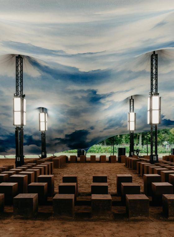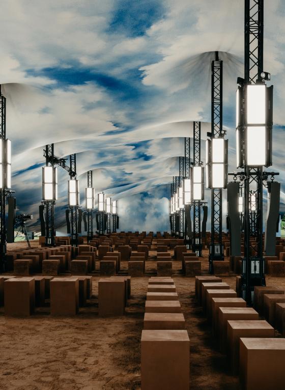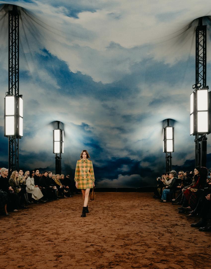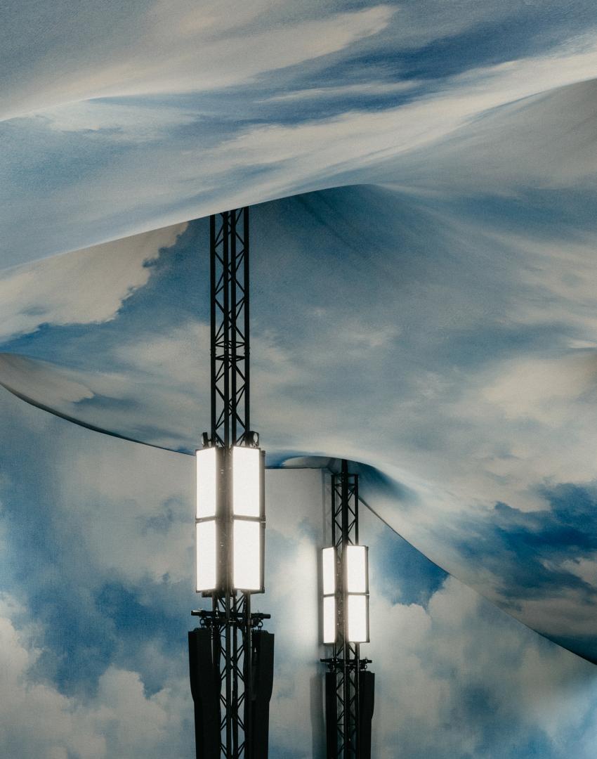 Set in the iconic Kensington Palace Gardens together we transformed the space into a breathtaking vision of the outdoors brought in. A printed sky scene with clouds stretched across the impressive fabric tent, complemented by an earth‑toned runway and cube‑shaped seating.